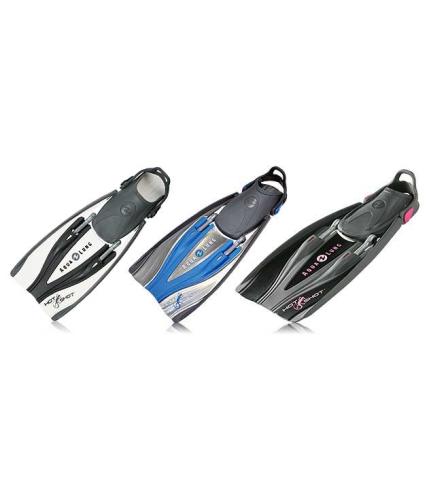 Compactness for carry-on travel. Power for a fully outfitted scuba diver. Comfort:The foot pocket is designed to be worn with bare feet! The top and sides of the foot pocket are soft against bare skin. Neoprene socks or thin-soled boots may be used for thermal protection. Unique, self-adjusting Comfo-strap is buckle free. This particular type of elastomer guarantees comfort. Mid-foot Flex Joint. The blade attaches to the sides of the foot pocket rather than at the front of the foot pocket. Prevents hyper-extension of the toes and ankles. Maximizes the transfer of power from the leg to the fin. Compact and Light Weight: Fits in carry-on luggage! Ideal with new Departure bag from Deep See. Measures only 20.9 in. / 53 cm overall length. Size regular weighs only 3.28 lbs / 1.5 kg. Geared with silicone slings (Power Bands). These pure silicone slings are loaded with energy during the power stroke, which they release prior to the upstroke. Twin-Speed Gear Shift. The silicone Power Bands form the HotShot gear system. The gear shift allows the diver to choose the best speed-to effort ratio. Divers can change gear settings while wearing the fins. The blade is made of a semi rigid customized technopolymer. The result is an excellent spring effect and flexibility to maximize thrust.The rubberized ribs are made of two different elastomeric compounds to provide the greatest elasticity. Other features: Comes in three sizes: small, regular, large/x-large. Anti-slip rubber pads on the bottom of fin keep divers safe on boat decks. Grooves along inside bottom of foot pocket prevent foot from being vacuum-sealed in foot pocket making doffing easy. Power bands are protected on the bottom to prevent contact with the ground. ***Pink color only available in sizes Small and Regular***