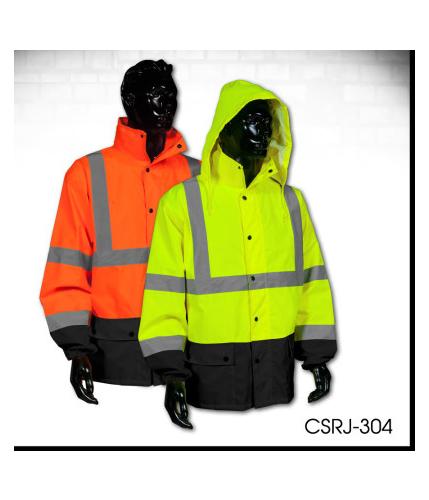 The CSRJ-304 is a Class3 waterproof jacket that fully conforms to ANSI107-2010. Made from 100% PU coated polyester fabric this garment has the extra comfort of a soft sewn in mesh liner and a fashionable black front to hide the dirt. All seams are taped to ensure that garment maintains its integrity in the wettest of weathers. It has a zippered front closure with a storm flap that snaps into place, two deep flapped front pockets, and a rollaway Rain Hood. It is a perfect match for our CSRP002 Black Bottomed Rain Pants which make a great set but are sold separately. Sizes MD-5X.