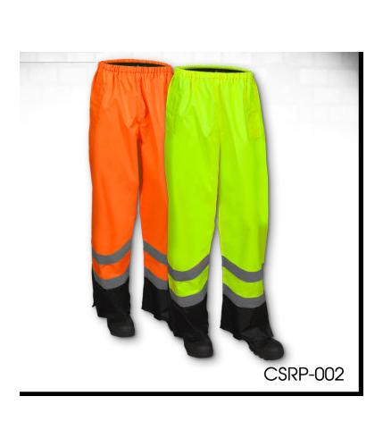 The CSRP002 is a Class E rated garment which when worn with any Class 2 rated upper wear will create a Class 3 uniform which fully conforms to ANSI107-2010. The pants are generously cut from 100% PU coated polyester and have fully taped seams to ensure that they remain water tight. They have two pass through side pockets and adjustable ankle snaps for added comfort. The design includes a fashionable deep black cuff that keeps the garment looking clean in the worst of the weather. The pant is designed to match with our CSRJ304 to create a complete rain suit. Items sold separately. Sizes MD-5X.