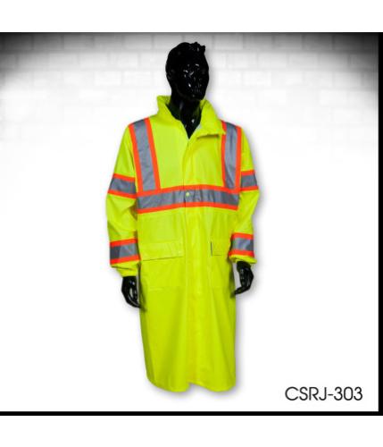 The CSRJ-303 is a Class3 is a waterproof 48” long, rain coat that fully conforms to ANSI, 107-2010. It is made from a 100% PU coated, breathable polyester fabric and has all seams taped to ensure full waterproof protection. The 3M contrasting trim reflective, the established industry standard for DOT rainwear, helps the user stand out more clearly in the bad weather. The garment is breathable and comes with two deep flapped and studded front pockets together with a full length, zippered front with a protective storm flap. It also has a rollaway Rain Hood built in. The garment is a perfect match for our CSRP-003 DOT style rain pants, which are designed as a set but are sold separately, Sized MD-5X.