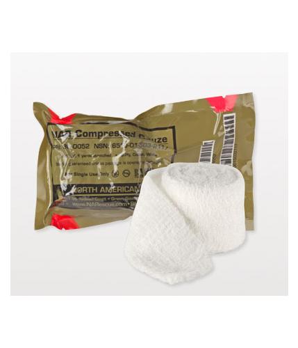 Special Features: 4.5" x 4.1 yd Sterile, 6-ply cotton gauze up to 5 year expiry, Made in the U.S. & Berry Amendment Compliant. The compressed, rolled gauze is ideal for wound bandaging and wrapping of injuries. High quality U.S. cotton provides maximum absorption to help control bleeding. Small, compact size that expands to cover larger wound areas. Used as backing gauze for hemostatic agents, in conjunction with a compression bandage to control hemorrhage, or for minor wound bandaging. Packaged in a low cube space, rugged and durable vacuum sealed container featuring NAR Red Tip Technology with tear notches for easy opening. Dimensions: Packaged: L 3 in. x W 2 in. x D 1.5 in. Weight: 1.2 oz