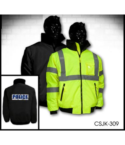 The CSJK-309 is a Class 3 Premium Public Safety Reversible Bomber Jacket (ANSI 107-2010). It is made with a weatherproof polyester shell with taped seams, inside Polyfil insulation, 2” reflective tape, adjustable cuffs and zipper closure. Main features include fully reversible to be able to wear as a black jacket, long side zippers for utility belt access, a roll away hood and a personalization access zipper. Also, it has Badge access tab on front left chest, 2 mic tabs and 6 pockets (2 deep side waist pockets on hi vis side and reverse side of jacket, a cell phone/clear ID pocket and an additional waterproof easy release 11” x 6” (enforcement ID pocket on the back). It is available in both orange and yellow with generous sizes from medium to 5xlarge.