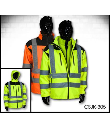 The CSJK-305 is a Class 3 Premium Sports Series Soft Shell Jacket (ANSI 107-2010).It is made with a waterproof polyester soft shell with taped seams, a black bottom front, 2” 3M Scotchlite tape, adjustable storm cuffs and a heavy duty weatherproof zipper closure. Main features include a non ANSI removable jacket, black trim throughout and detachable storm hood w/ peak. Also, it has 4 weatherproof outside pockets (2 zippered waist pockets and 2 zippered chest pockets), 1 inner chest pocket and a personalization access zipper. It is available in both orange and yellow with sizes medium to 5xlarge.