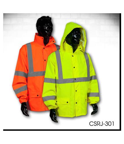 The CSRJ-301 is a Class 3 waterproof jacket that fully conforms to ANSI107-2010. Made from 100% polyester PU coated fabric, all its seam lines are taped to ensure full waterproof protection to keep the wearer dry and comfortable in the wettest of weather. It features two storm proof, snapped deep waist pockets and a rollaway Rain Hood. It is a perfect match for the CSRP001 rain pants which are designed as a set but are sold separately. It comes sized MD-5X.