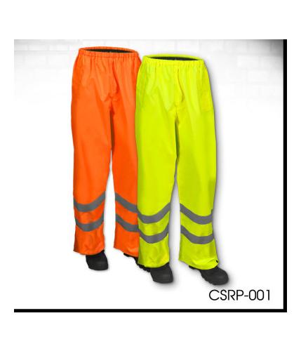 The CSRP-001 is a Class E rated garment which when worn together with any Class 2 rated vest, t-shirt, polo, sweater or jacket will create a Class 3 uniform which fully conforms to ANSI107-2010. The pants are generously cut from 100% PU coated polyester and have fully taped rainproof seams. The pants feature two pass through side pockets to allow for access to clothing worn beneath and ankle snaps for adjustable comfort. The garment is designed to match with CSRJ301 as a complete Rain Suit but the items are sold separately. Sizes MD-5X.