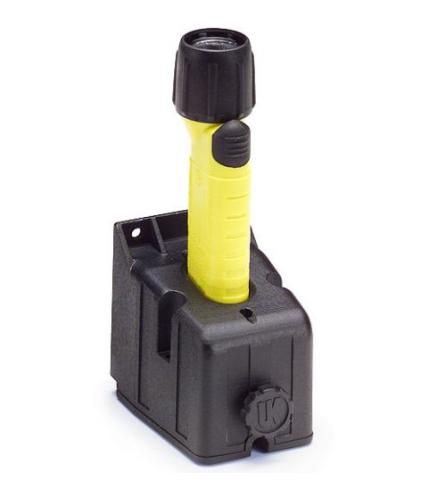 This rechargeable UK4AA work light is powered by high capacity nickel metal hydride cells which charge in 1.5 hours utilizing a drop-in fast-charge stand. A high intensity 4-watt xenon lamp runs for 1.5 hours on a charge. The waterproof light is actuated by a snap action thumb switch and the ABS/polycarbonate case is non-conductive and will not corrode. A wide array of accessories includes helmet mounts for all hard hats, nylon belt holster, auto charge adapters and a 2.1-watt xenon replacement lamp module. The UK4AA can be mounted on a hard hat or fire helmet and carried in a belt pouch. A necessity for confined space workers, utilities, municipalities, firefighters, safety inspectors, etc.